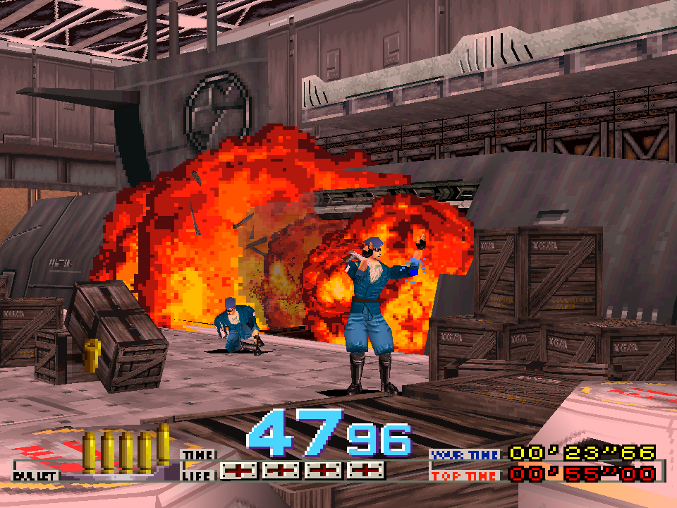 Time Crisis es un shooter tridimensional en primera persona desde un ferrocarril similar a Virtua Cop y The House of The Dead en el cual el jugador sostiene una pistola de luz y dispara a enemigos que ve sobre la pantalla.